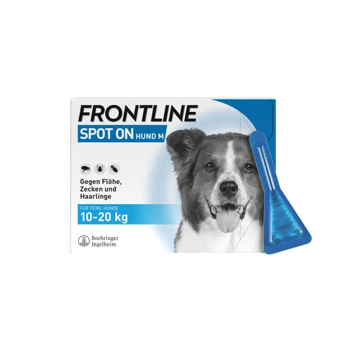 Frontline Spot On ist ein einfach aufzutragendes Fluid, das einen ausgezeichneten Schutz vor Flöhe und Zecken sowie vor LĂ€usen bei Ihrem Hund bietet. Frontline Spot On schĂŒtzt Ihren Hund 4 Wochen lang vor Zecken und Flöhe 5 Wochen bis 3 Monate lang. Nach der Anwendung sterben Flöhe innerhalb von 24 Stunden und Zecken oder LĂ€use innerhalb von 48 Stunden.