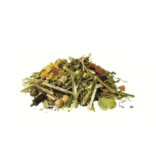 Luzerne, Apfeltrester, Sojabohnenflocken (getoastet), Kräutermischung, Sonnenblumensaat (geschrotet), Sonnenblumensaatschalen, Leinsamen, Erbsenflocken, Sojaöl, Karottenflocken, Kollagen (enzymatisch hydrolysiert), Leinkuchen, Bierhefe, Chicorée, Vitamine und Mineralstoffe, Prebiotika, Probiotika.